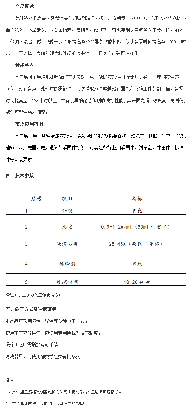 產品名稱:MX3180達克羅面涂涂料(彩色)